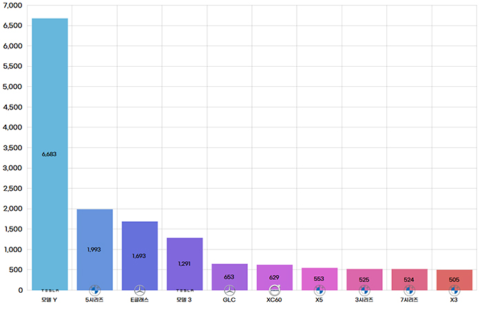 모델 Y에게 밀린 BMW 5시리즈와 벤츠 E클래스는 각각 2위와 3위에 올랐으며 부분변경으로 상품성을 강화한 볼보 XC60, 변함없는 인기의 BMW X5, 그리고 7시리즈 등의 차종들이 새롭게 10위권에 이름을 올렸다.