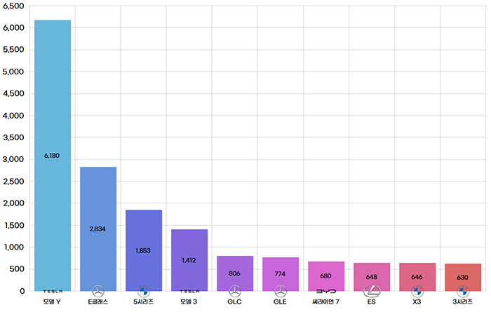 10위권 밖에서는 미니 미니 쿠퍼가 11위, 볼보 XC60이 12위, BMW X5가 13위에 올랐으며, 테슬라 사이버트럭이 출고를 시작하면서 36대가 등록된 것이 눈에 띈다.