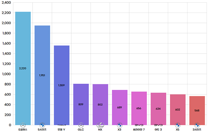 1월의 수입차 1위 차종은 벤츠 E클래스다. 전월 대비 36.6% 감소한 신차등록대수를 기록했으나 다른 상위권 차종들의 성적도 동반 하락하면서 1위에 오를 수 있었다. 2위는 BMW 5시리즈가 차지했으며, 지난해의 베스트셀링카였던 테슬라 모델 Y가 전기차의 겨울잠 시기인 1월임에도 불구하고 1,599대 등록되면서 3위에 이름을 올렸다. 모델 Y의 지난해 1월 판매량은 0대였다.